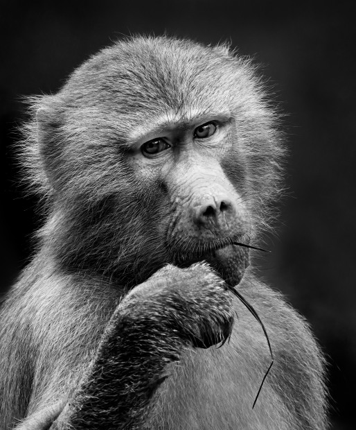 A baboon paused in his daily activities to look contemplating towards me whilst nibbling on a length of grass. I feel sure it was considering who I was and my purpose for studying him with my big black 'eye'.