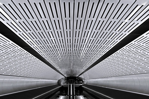 This architectural image emphasizes symmetry and depth in a modern underground space. Linear patterns guide the eye to a central vanishing point.