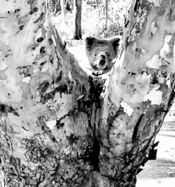 A koala peers quietly from within the fork of a eucalypt, held gently by the Australian landscape. There is a subtle cheekiness in its gaze—present, aware, and completely at home. In this moment, the land does more than surround; it cradles.