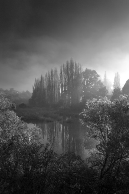 Creekside - Candelo, Bega Valley, NSW. Morning fog burns off as the sun cuts through onto the autumnal leaves of the poplars to create layers of light.