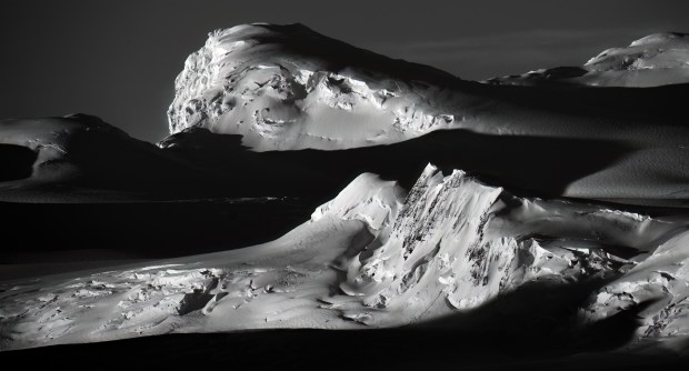 Spring's slowly setting sun casts its creeping chiaroscuro across the steep peaks of the Antarctic Peninsula, near Wilhelmina Bay
