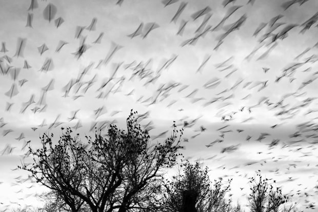 Crows circling en masse at the end of the day, coming in to roost for the night