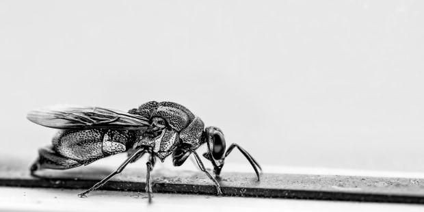 This is a Cuckoo Wasp (or Emerald Wasp as people know it as). In colour it is a spectacular display of emerald colours and in B&W you can see the texture of the wasp in more detail.