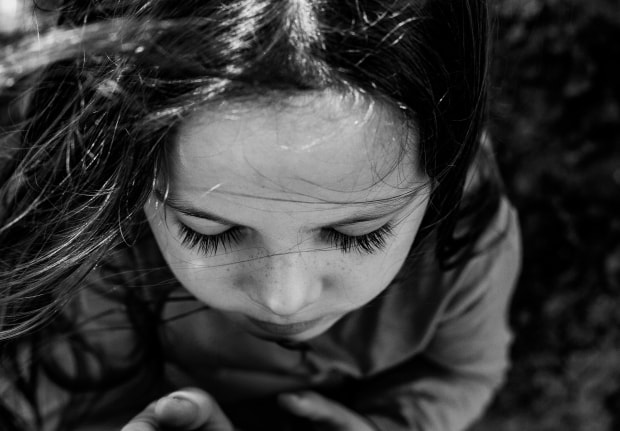 I took this photo of my granddaughter as she played outside. She was very intently looking at something and her little freckles and long eyelashes only enhanced her childlike beauty.