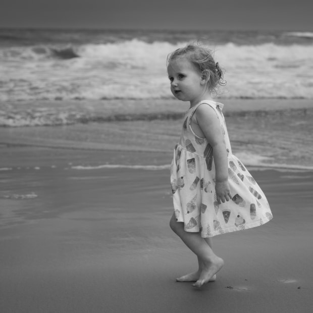 AN INAUGURAL TRIP TO THE BEACH FOR THIS BEMUSED TODDLER SPARKS CURIOSITY WITHIN HER EVERY CELL.