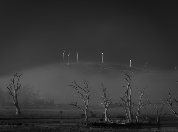I took several shots of this scene as the fog was lifting rapidly with the rising sun. I loved the contrast of the ancient dead trees and the stark outline of the wind turbines in the distance, with the band of fog in between