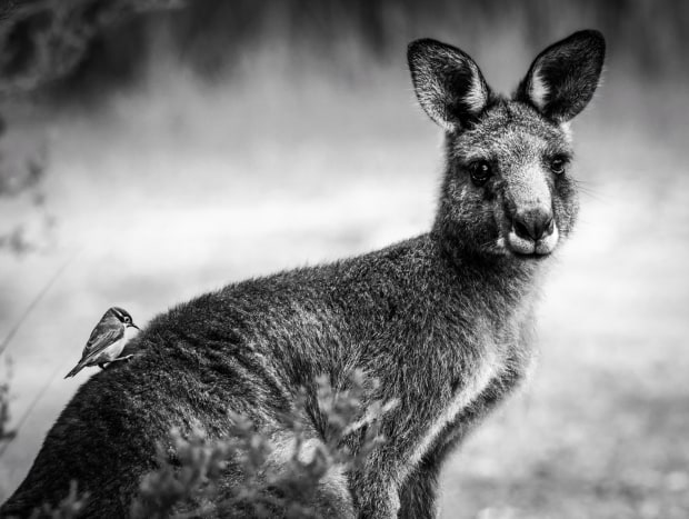 A lone Eastern Grey Kangaroo feeding beside the fire trail has a little help from a feathered friend who was very intent on ‘debugging’ the situation.