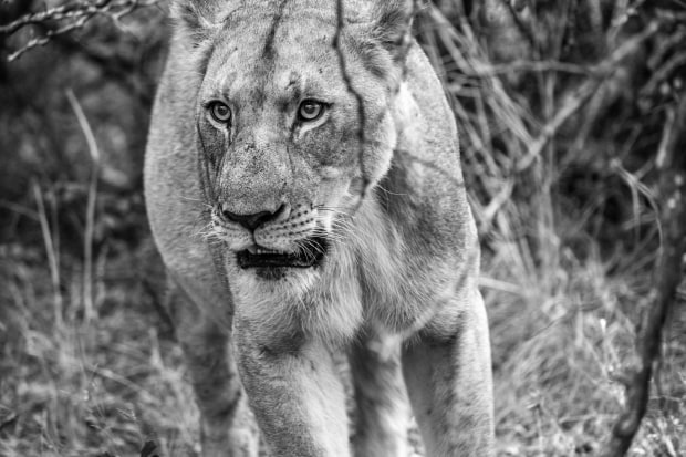 Two sister lionesses were half asleep near their kill, a magnificant waterbuck thatI had photographed very much alive the day before. int was early in the day and the lionesses had only eaten a little of their prey. When a cackle of spotted hyena appeared on the scene both sisters sprung into action to drive them away. That determination is clear in this image. Hyena are both persistent and patient. I'm sure they eventually won out, hopefully after the sisters had their fill. Zulu Natal, South Africa.