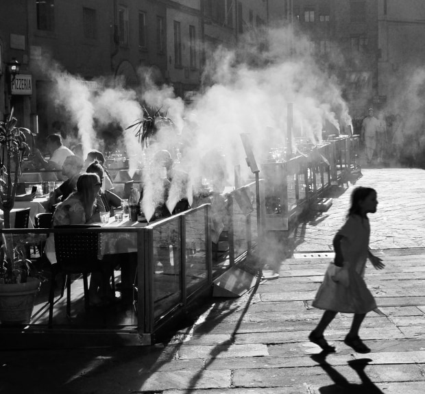 Streetscape photo with water mist cooling people dining at tables, while girl running across the street.