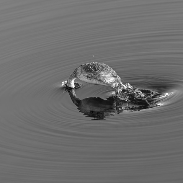 Early morning, very little wind and still water at Risdon Dam. I could see a Hoary-headed Grebe and was able to capture it diving for food.