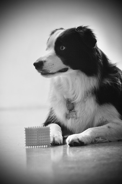 Border collie sitting sill with her toy waiting for it to be thrown.
