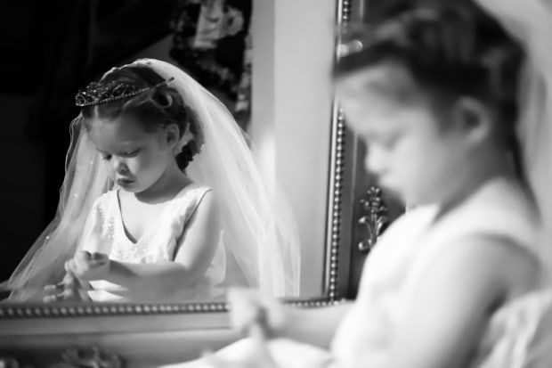 Ayla playing dress ups with mummy’s wedding dress, veil and tiara