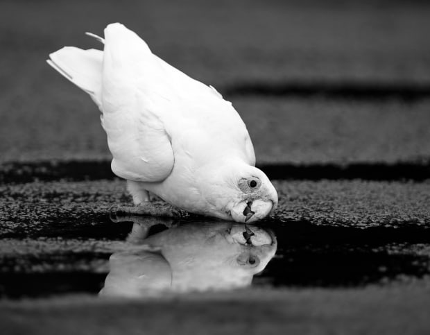I sat low on the damp asphalt at our local sporting ground, hoping not to disturb the Little Corellas as they splashed and drank from the summer rain puddles. This Corella took a moment for a quiet sip, providing a perfect reflection in the still water of the puddle. He gave me only a few seconds but it was enough to capture his playful spirit.
