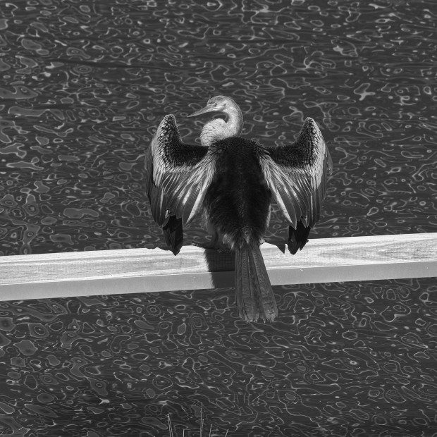 Sea bird dries off after diving for food in the Yarra. The perch is part of the floating wetlands rejuvenation areas near the Webb bridge, Melbourne.