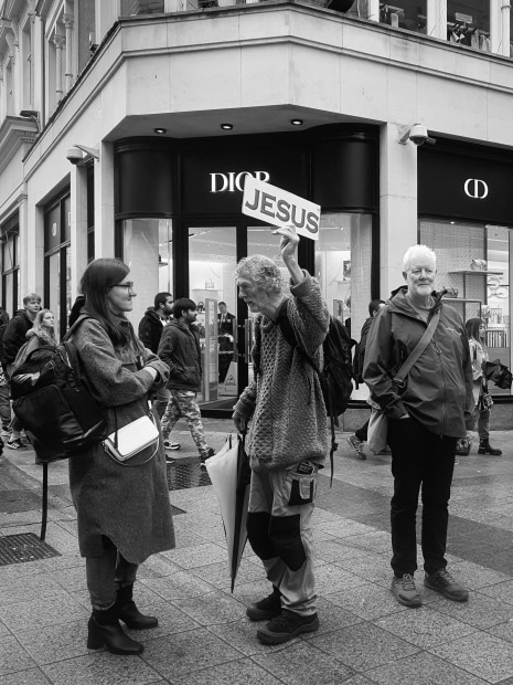 The sign is ambiguous and so, to quote from the lyrics of Dire Straits' Industrial Disease:"Two men say they're Jesus, one of them must be wrong." I found these Jesuses outside a designer shop in Dublin's Grafton St.