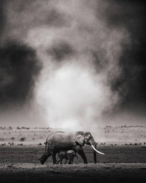 An elephant mother shields her calf from a 'dust devil' whirlwind in the dry area of Amboseli, Kenya