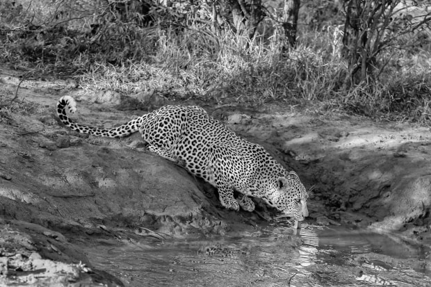 Large male leopard drinking from a shallow puddle in the Timbavati, Greater Kruger Park, South Africa