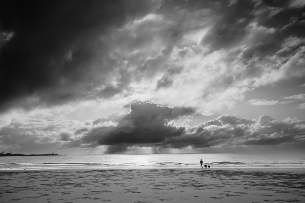 A big low tide, morning storms off the coast, the sun hidden behind low heavy clouds, crepuscular rays shining down on the horizon