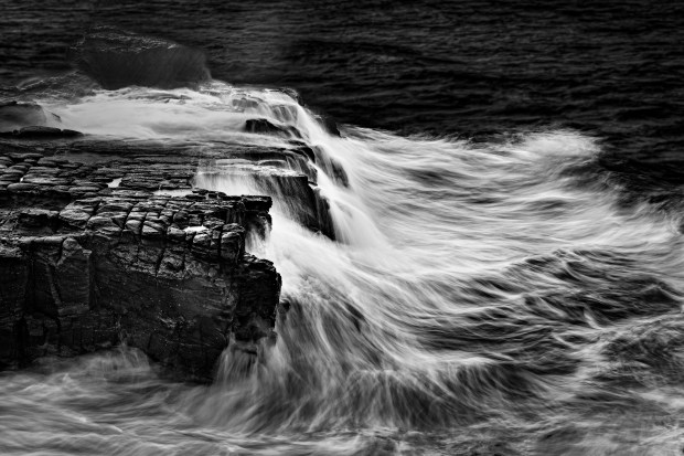 Catching the reverse power of the ocean as it retreats from the rocky shore Yamba