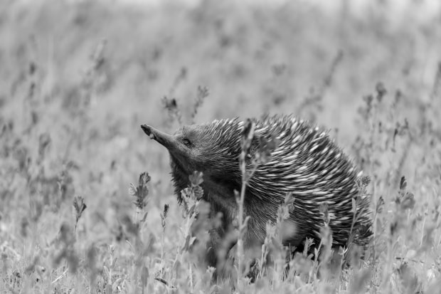 A cute echidna waddles through a sea of colorful wildflowers, its spiky coat contrasting with the soft petals around it. This little Australian native perfectly blends into the vibrant spring landscape, making for an adorable wildlife moment