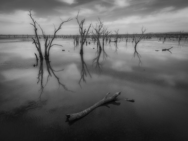 This image depicts a haunting, monochromatic scene of a flooded landscape with barren, leafless trees standing in shallow water. The reflections of the trees on the water's surface create a mirror-like effect, adding to the eerie atmosphere. A single piece of driftwood lies in the foreground, enhancing the desolate mood. The sky is overcast with heavy, gray clouds, contributing to the overall somber tone of the image.