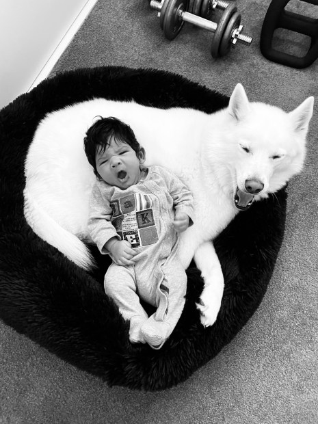 My baby Elias with our dog bear, so gentle with our kids.