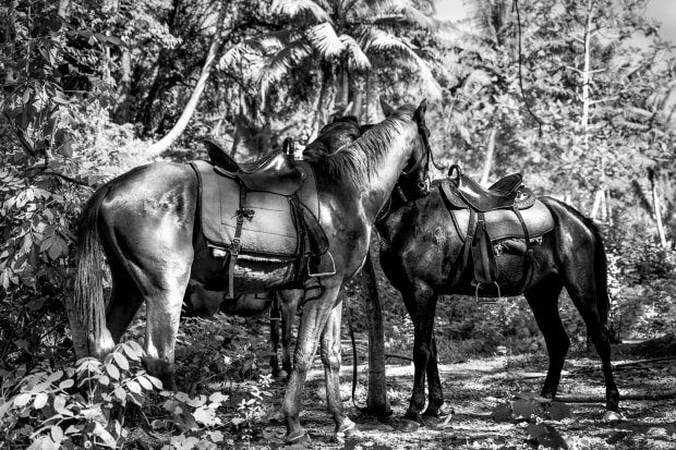A Mother horse greets her daughter in a warm embrace after a trek through the Fiji forest.