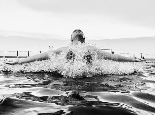 A young teen emerging from the water and symbolising emerging into adulthood in contemporary Australia.