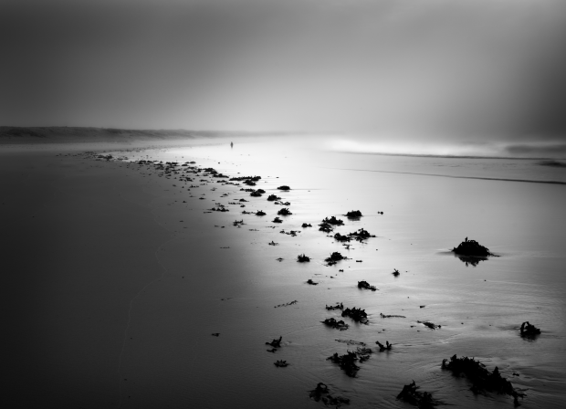 Sunrise pushing through a thick fog onto a lone walker on Nobbys Beach, Newcastle Australia