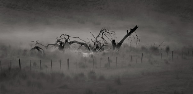 Tortured gum limbs emerging through the evening fog on the trip home along the Burke and Wills Track in Victoria.