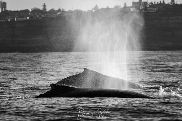 A pair of humpback whales on their annual migration past Sydney, exhale - backlit by the late afternoon sun.