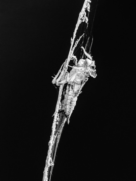 Exoskeleton of the larval form of a dragonfly, left behind on a stem at the water's edge