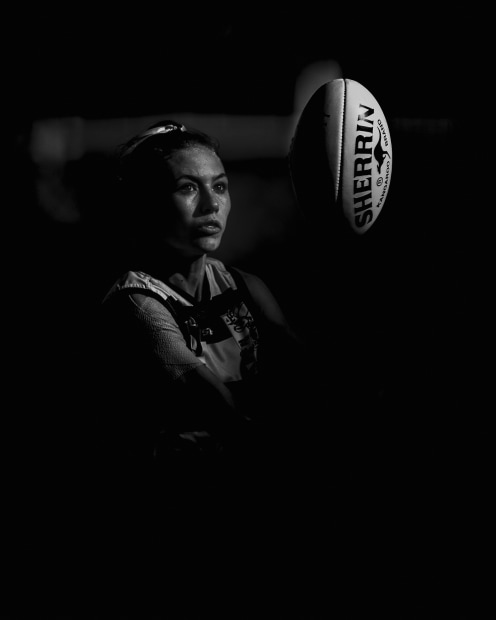 Female AFL player keeps her on eyes on the ball during a game in the QAFLW