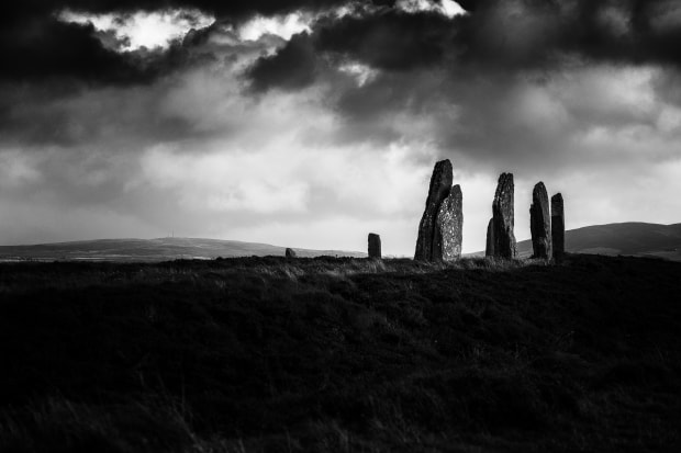 This image was taken in Orkney Scotland of the five thousand year old standing stones known as the Ring of Brodgar. It was a cold, windy, drizzly and dark day. In the distance can be seen modern power poles. Amongst many other extraordinary emotions As they both stand facing one another I had the feeling that there was almost a "stand off" as to which group might still be there in another five thousand years.