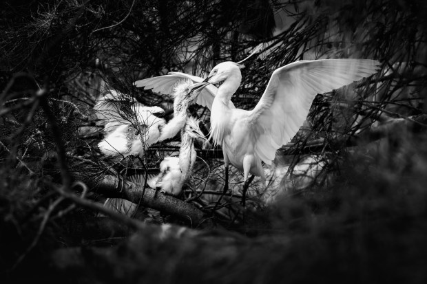 An adult Great Egret feeding her young chicks whom hasn't had enough and continues to bite on the feeding adult screaming for more food.