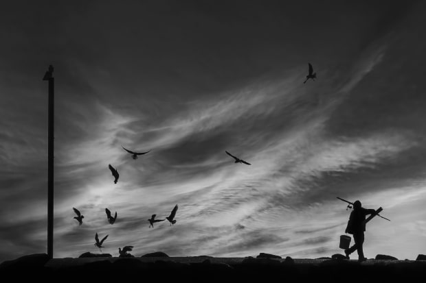 A fisherman leaves behind fish scraps for the local seagulls.