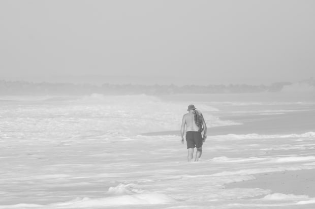 Forced into early retirement due to health issues this boy from the bush is now spending his time enjoying beach life and when pain and grief overwhelms, walking in the waves is where he finds solace. I captured this shot on a very warm sea misty morning.