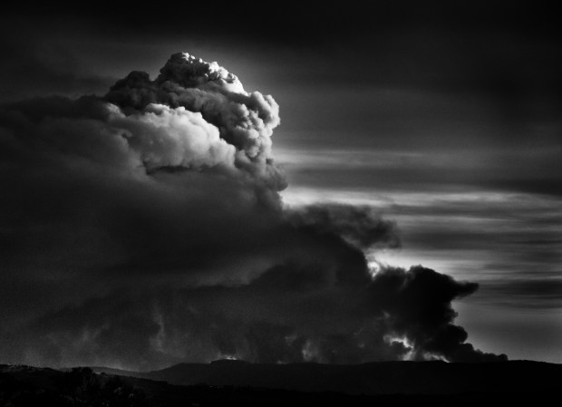 A fire cloud illuminated at sunset during the devastating 2020 summer of bushfires.