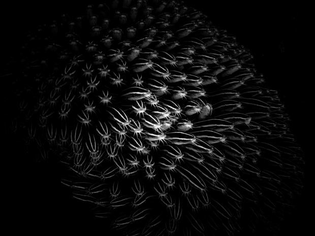 Whilst snorkelling on The Ningaloo Reef, I dived to take a closer look inside the small cave of a bombie and this school of black and white striped catfish approached my dome in a striking formation.