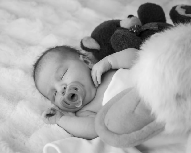 Nestled in the softness of early life, this image captures the quiet vulnerability and peaceful beginnings of a newborn's journey. Stripped of color, the monochrome tones heighten the intimacy—every delicate feature, from the tiny fingers to the gentle curl of the lashes, speaks to the purity and fragility of new life. The gentle contrast of textures—plush toys, soft skin, and fluffy blankets—draws the viewer into a moment of stillness, love, and the silent bond between a child and the world awaiting them.