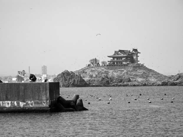 The Kabushima shrine marks the start of the 1000km Michinoku trail along the coast of Honshu devastated by the Tsunami in 2011. The shrine is built on the nesting place of black tailed gulls. The coast is the richest fishing ground in Japan and here a fisherman tries his luck.