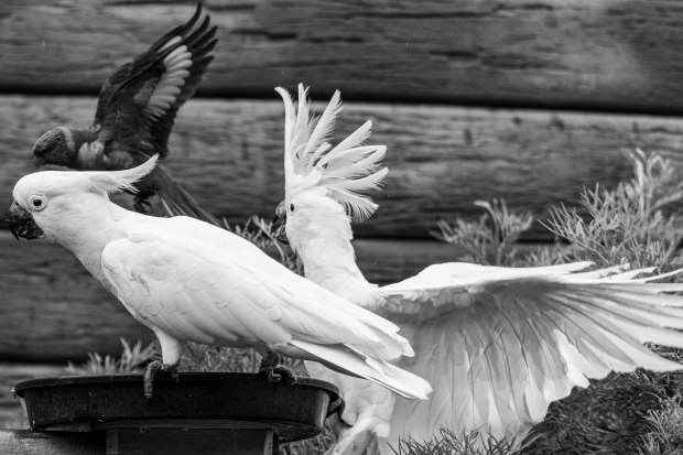The rainbow lorikeet is doing a flyby while the cockatoos are eating