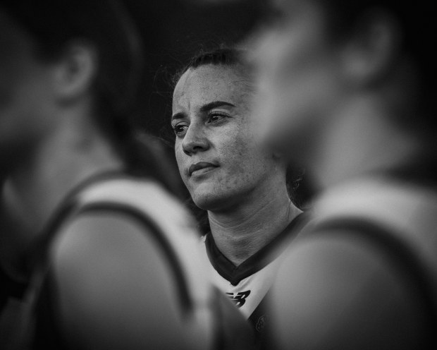 Moreton Bay Lions QALW player Jessica Davy focuses on her coach during a quarter time break