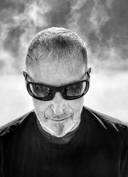 Jim, with dense fog rapidly lifting behind him into a blue sky day off the surface of the Pacific ocean far below.