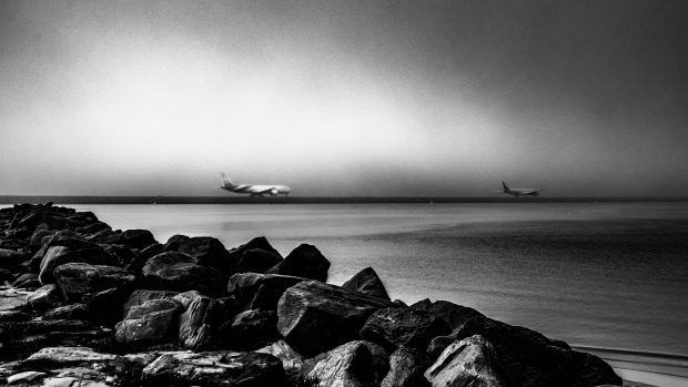 A photo taken from the beach at Brighton Le Sands of planes landing at the runways at Sydney Airport on this very foggy day, can only hear the drones and out of the fog the planes appear and then they go off again into the fog at the end of the runway and hear the take off, spine chilling if an accident happens!