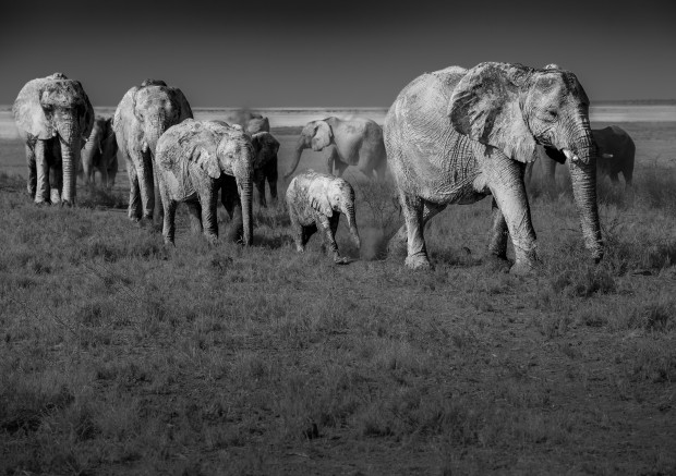 A determined matriarch leads her family away from the Etosha saltpan, after dusting themselves with the white dust of the pan. The strength, cohesion and complete trust of the Elephant family group shines through as they follow her lead, never deviating from the path she chooses. Familiar paths, well-trodden and lessons learnt, passed down from previous generations. Ever vigilant and protective she raises her trunk and tests the air, checking us out, and watching carefully as she passes to ensure we do not enter the safe space around her family group.