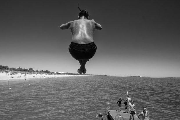 One of the jetty jumpers at Coogee Beach, south of Perth is perfectly poised on the horizon momentarily, before he falls to the ocean below.
