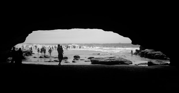 This image was captured while sitting in the darkness, protected by the harsh summer Australian sun at Caves Beach NSW in the New Year of 2023. It was only mid morning and already the day was warm and bright drawing crowds to the beach.