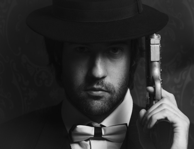 Playing with old Hollywood lighting setups with Model David Kennedy, who was dressed the part in bowtie and fedora hat. The gun is fake.