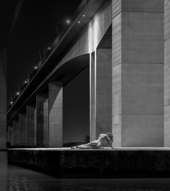 Reclining nude under the Gateway Bridge on the Brisbane River. The model is Riley Jade.